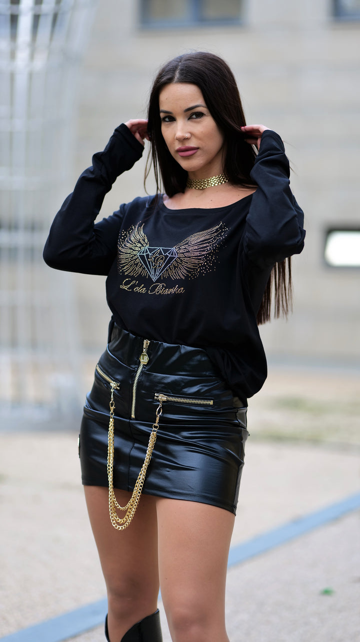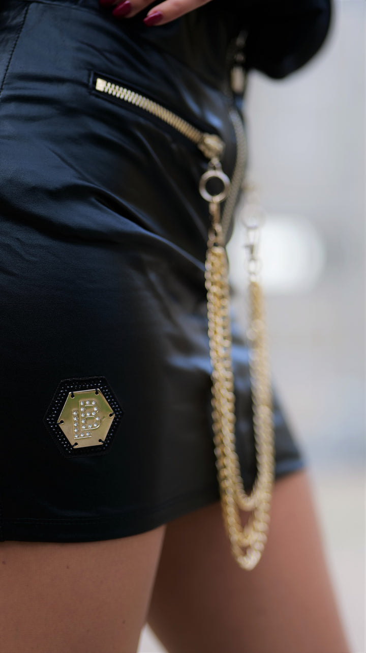 Esta minisaia em vinilo com elastano combina sensualidade y modernidade num design marcante. O seu fecho personalizado da marca e logomarca em hexágono dorado acrescentam um toque exclusivo y elegante.