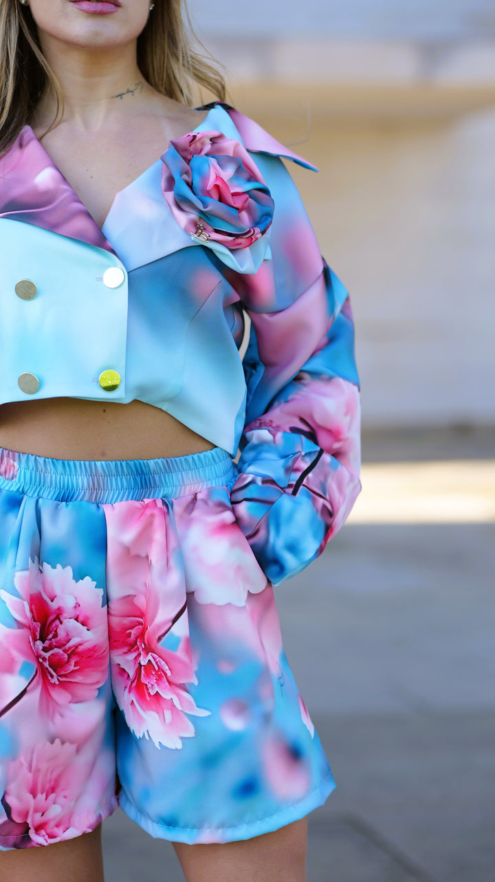 🔸 Blazer estilo curto con padrão floral delicado , transmitiendo toda la leveza y frescor da primavera/verão . A flor amovível na lapela adiciona um detalle único y personalizado, permitindo criar diferentes estilos.
