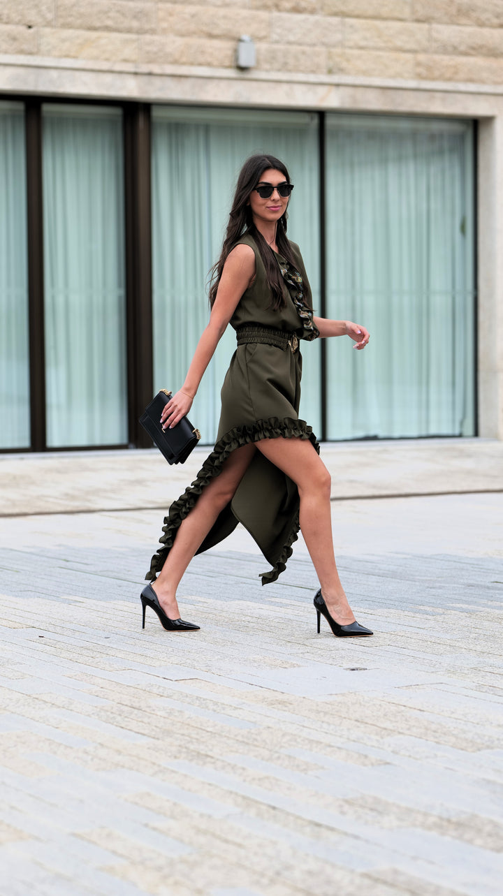 Este vestido asimétrico es perfecto para lograr un aspecto visual moderno y elegante. Con un corte único y sem mangas, ele oferece uma silhueta ousada e feminina. El cinturón incluye ajusta a la cintura, proporcionando un caimento impecable y destacando una figura. Ideal para ocasiones especiales o eventos casuales-chic, este vestido combina sofisticación y comodidad de manera simple y sofisticada. Combínalo con sandalias de salto para un look completo y marcante.