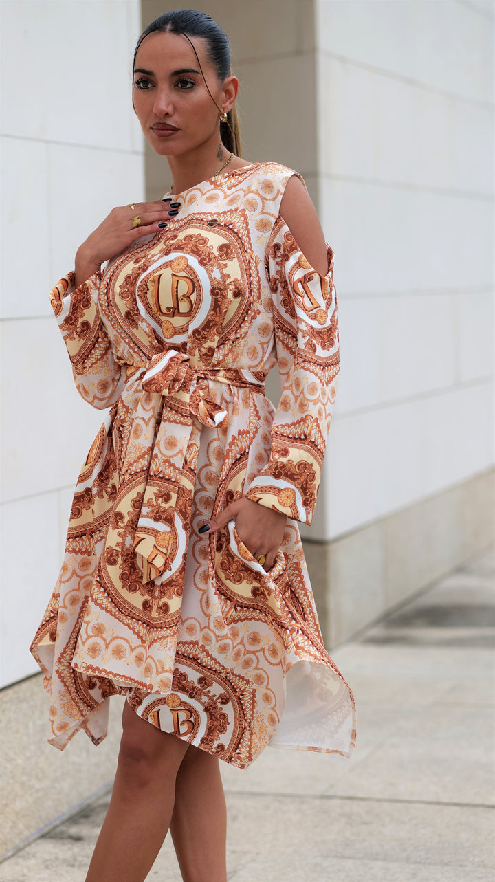 Este deslumbrante vestido presenta un padrón exclusivo de la marca LB , inspirado en un estilo renacentista con mandalas y logotipos en toneladas doradas , criando un contraste cómodo sobre el tejido blanco elegante .