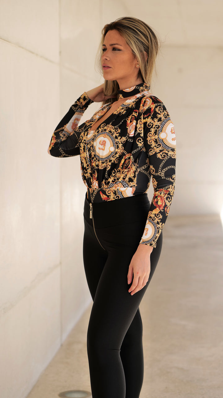 Este body em tecido licrado com padrão barroco original da marca é uma peça ousada e elegante, perfeita para dar um toque de requinte e personalidade a qualquer look.