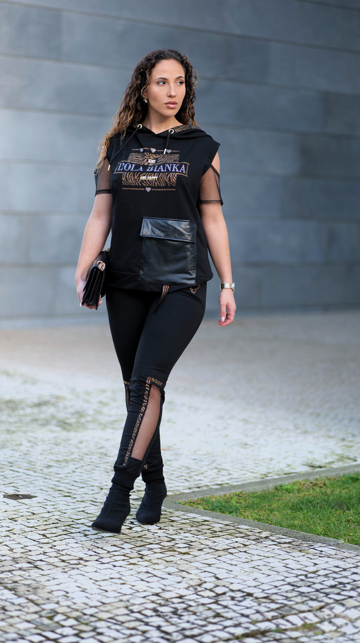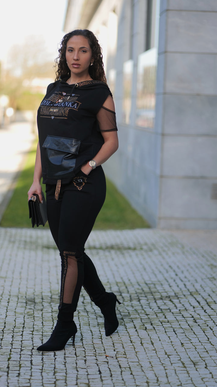 O design ajustado da calça realça a silhueta, enquanto a camisola proporciona conforto e estilo. Ideal para quem procura um look moderno e cheio de personalidade.