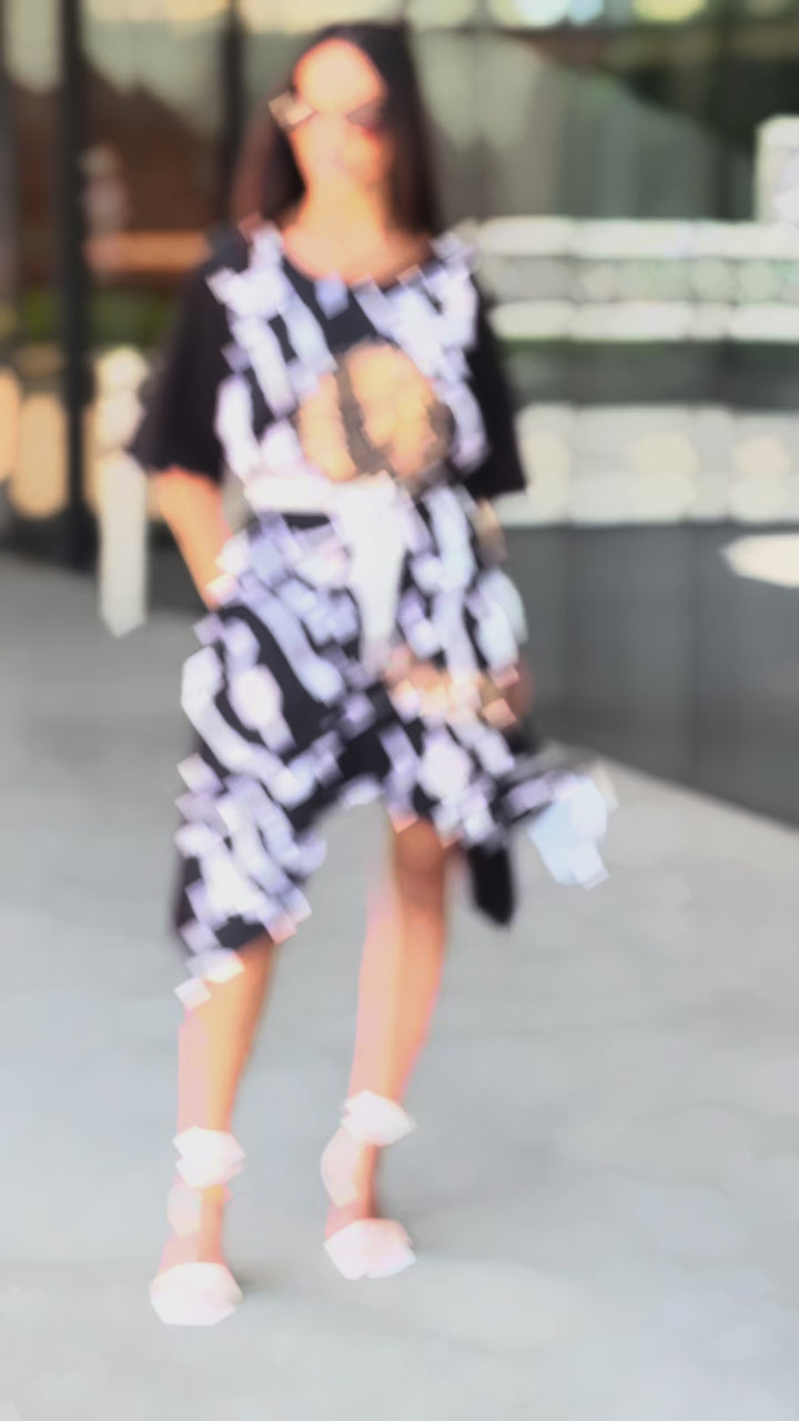 Este vestido assimétrico combina diferentes texturas e cortes para um look moderno e marcante, perfeito para quem procura destacar-se com originalidade.
